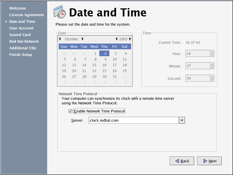You may also synchronize your date and time automatically with a network time server — a computer that sends accurate date and time settings to your system through a network connection. Check the box labeled Enable Network Time Protocol and use the drop-down menu to select the time server you want to use. Once you have set your time and date, click Next to continue.