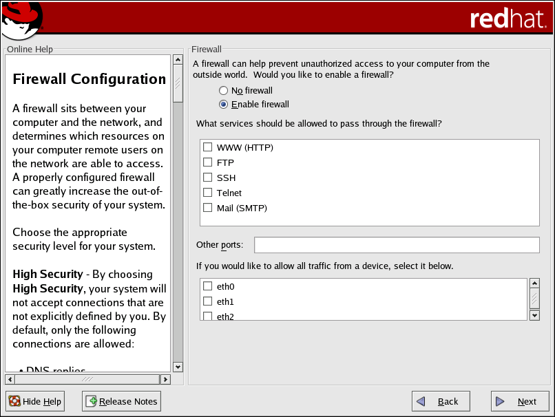 No firewall provides complete access to your system and does no security checking. Security checking is the disabling of access to certain services. This should only be selected if you are running on a trusted network (not the Internet) or plan to do more firewall configuration later.