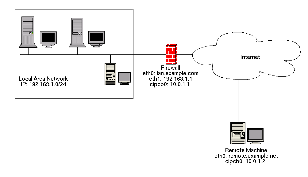 This diagram shows a network running CIPE on the firewall, and a remote client machine acting as a CIPE-enabled node. The CIPE connection acts as a tunnel through which all Intranet-bound data is routed between remote nodes. All data is encrypted using dynamically-generated 128-bit keys and can be further compressed for large file transfers or to tunnel X applications to a remote host. CIPE can be configured for communication between two or more CIPE-enabled Linux machines and has network drivers for Win32-based operating systems.
