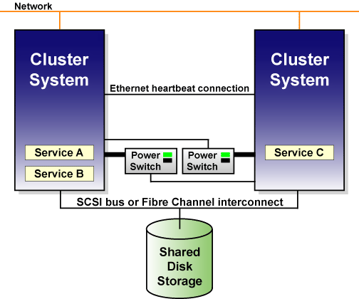 You can set up an active-active configuration in which the members run different services, or a hot-standby configuration in which a primary member runs all the services, and a backup cluster system takes over only if the primary system fails.