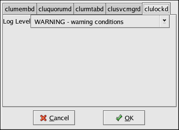 Log Level — Determines the level of event messages that get logged to the cluster log file (by default /var/log/messages). Choose the appropriate logging level from the menu. Refer to Section 3.12 Configuring syslogd Event Logging for more information.