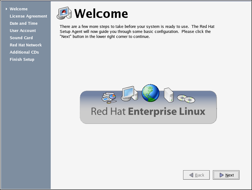 The first time you start your Red Hat Enterprise Linux system, the Setup Agent is presented. The Setup Agent guides you through the configuration of your Red Hat Enterprise Linux system. Using this tool, you can set your system time and date, add users to your system, install software, register your machine with the Red Hat Network, and more. Setup Agent allows you to configure your environment at the beginning, so that you can get started using your Red Hat Enterprise Linux system quickly.