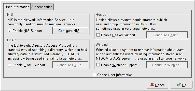 The Authentication Configuration Tool provides a graphical interface for configuring NIS, LDAP, and Hesiod to retrieve user information as well as for configuring LDAP, Kerberos, and SMB as authentication protocols.