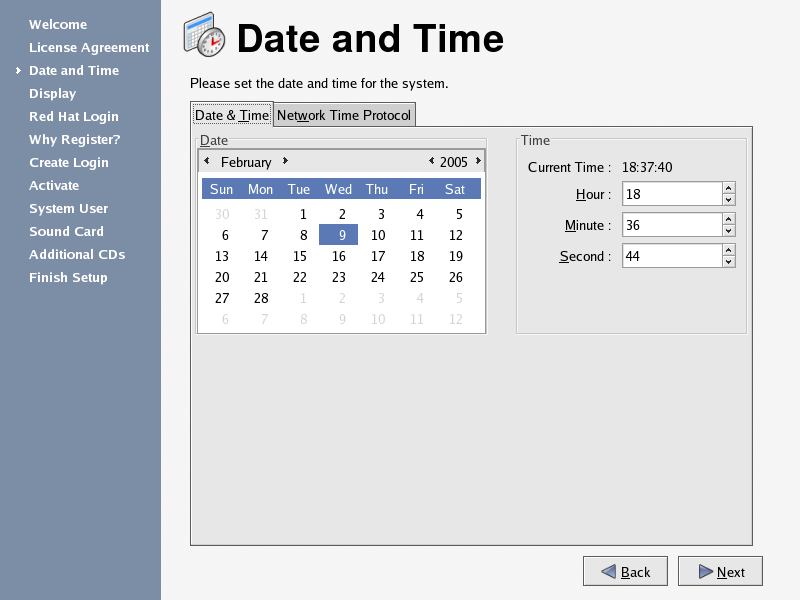 You may also synchronize your date and time automatically with a network time server — a computer that sends accurate date and time settings to your system through a network connection. Select, the Network Time Protocol, check the box labeled Enable Network Time Protocol, and use the drop-down menu to select a time server. Once you have set your time and date, click Next to continue.