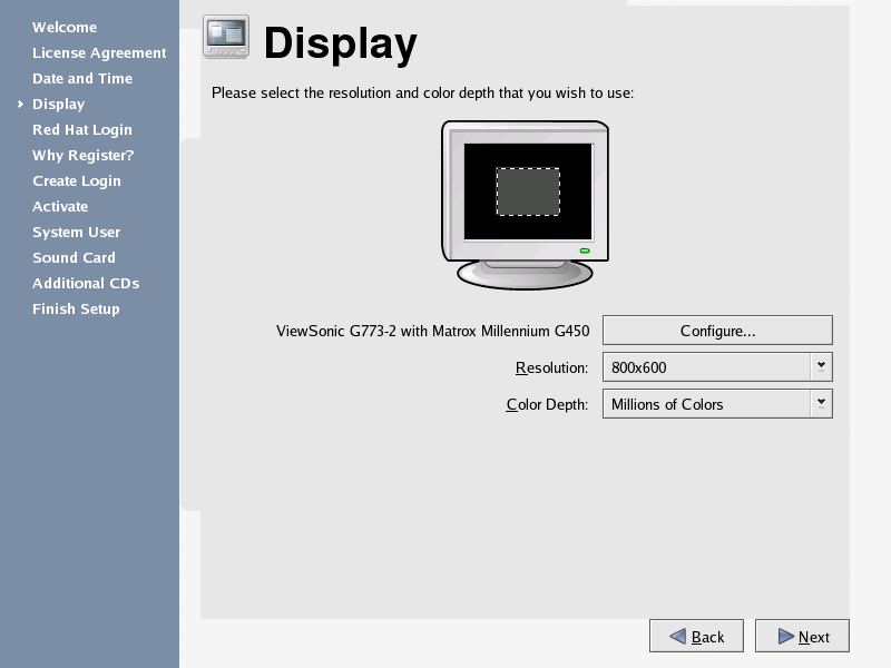 Next, configure your display. Red Hat Enterprise Linux auto-detects your monitor and loads the correct driver. If you would like to choose another driver, click on the Configure... button and browse the list of available drivers. Select the resolution of your screen and click Next to continue.