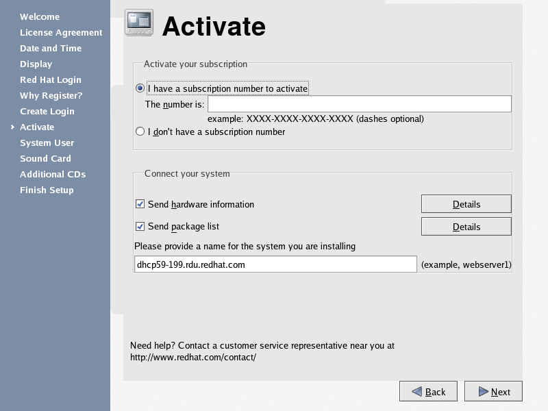 You must register your system with Red Hat Network to continue. Red Hat Network provides automatic updates of your Red Hat Enterprise Linux system, including security updates. If you have already registered with Red Hat Network, enter your account information in the appropriate field. If you have never registered, choose I don't have a Red Hat login. I need to create one.. Click Next — if you need to create a Red Hat login, the Red Hat Update Agent launches. After you have entered your Red Hat login information, the Setup Agent continues to the next screen.