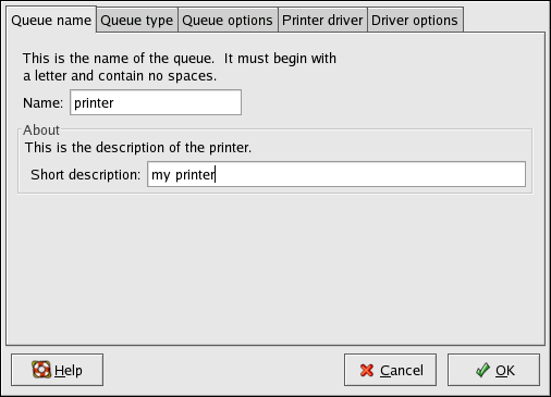 To rename a printer or change its short description, change the value in the Queue name tab. Click OK to return to the main window. The name of the printer should change in the printer list. Click Apply to save the change and restart the printer daemon.