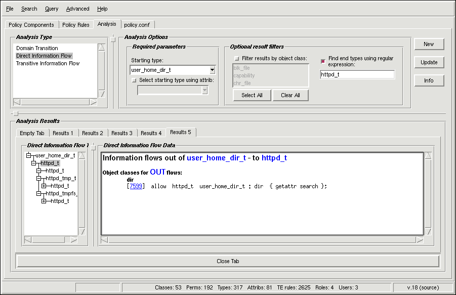 Information flow analysis is a central and challenging part of analyzing an SELinux policy. Your analysis may find unexpected or dangerous information flows. For example, if you want to be sure that the content in your /home/ directories (user_home_dir_t) is flowing as you configured it into the httpd_t domain, apol searches through the policy to reveal all the ways information flows between the two types. This search is show in Figure 6-8: