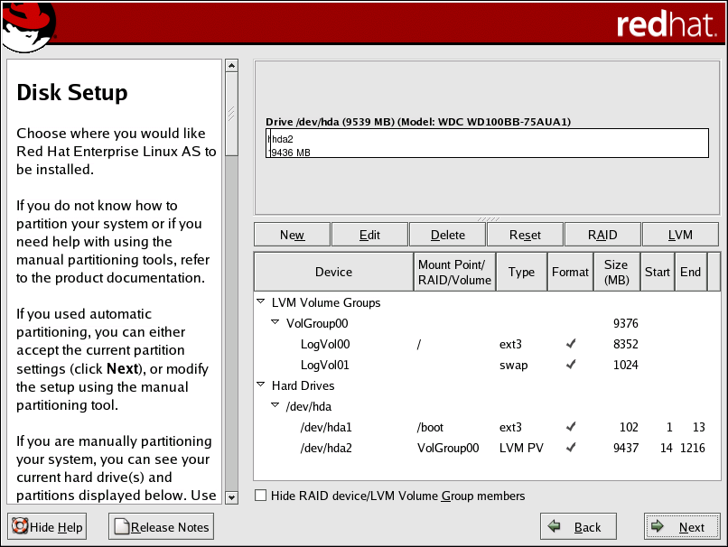 If you chose automatic partitioning and selected Review, you can either accept the current partition settings (click Next), or modify the setup using Disk Druid, the manual partitioning tool.