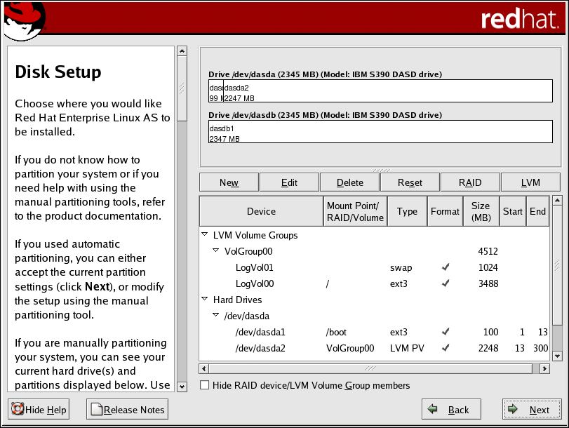 Hide RAID device/LVM Volume Group members: Select this option if you do not want to view any RAID device or LVM Volume Group members that have been created.